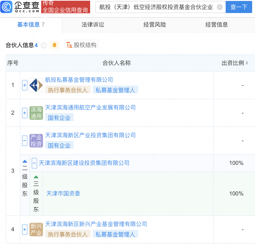企查查APP显示,近日,航投(天津)低空经济股权投资基金合伙企业(有限合伙)成立,出资额1亿元,经营范围包含:以私募基金从事股权投资、投资管理、资产管理等活动。企查查股权穿透显示,该企业由航投私募基金管理有限公司、天津滨海通用航空产业发展有限公司、天津滨海新区产业投资集团有限公司等共同出资。