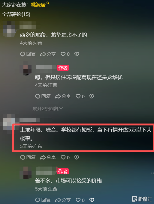 因为开盘前有网友预判价格——土地年限、噪音、学校都有短板,当下行情开盘5万以下大概率。
