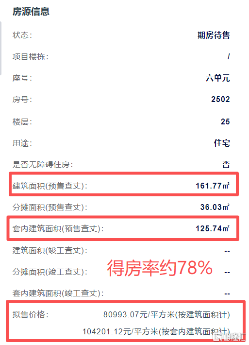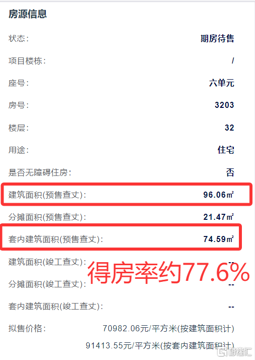 项目对外宣传的口径是新规户型,但实际户型得房率,根据深圳房地产信息平台,仅78%~79%,算上凸窗、阳台赠送面积,得房率才提升至96.05%~98.22%。