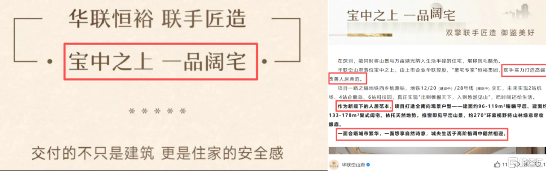 项目定位是“宝中阔宅”“都市生活的艺术跃升”“高品质住宅”“延续了华联匠心品质与恒裕豪宅基因”等。