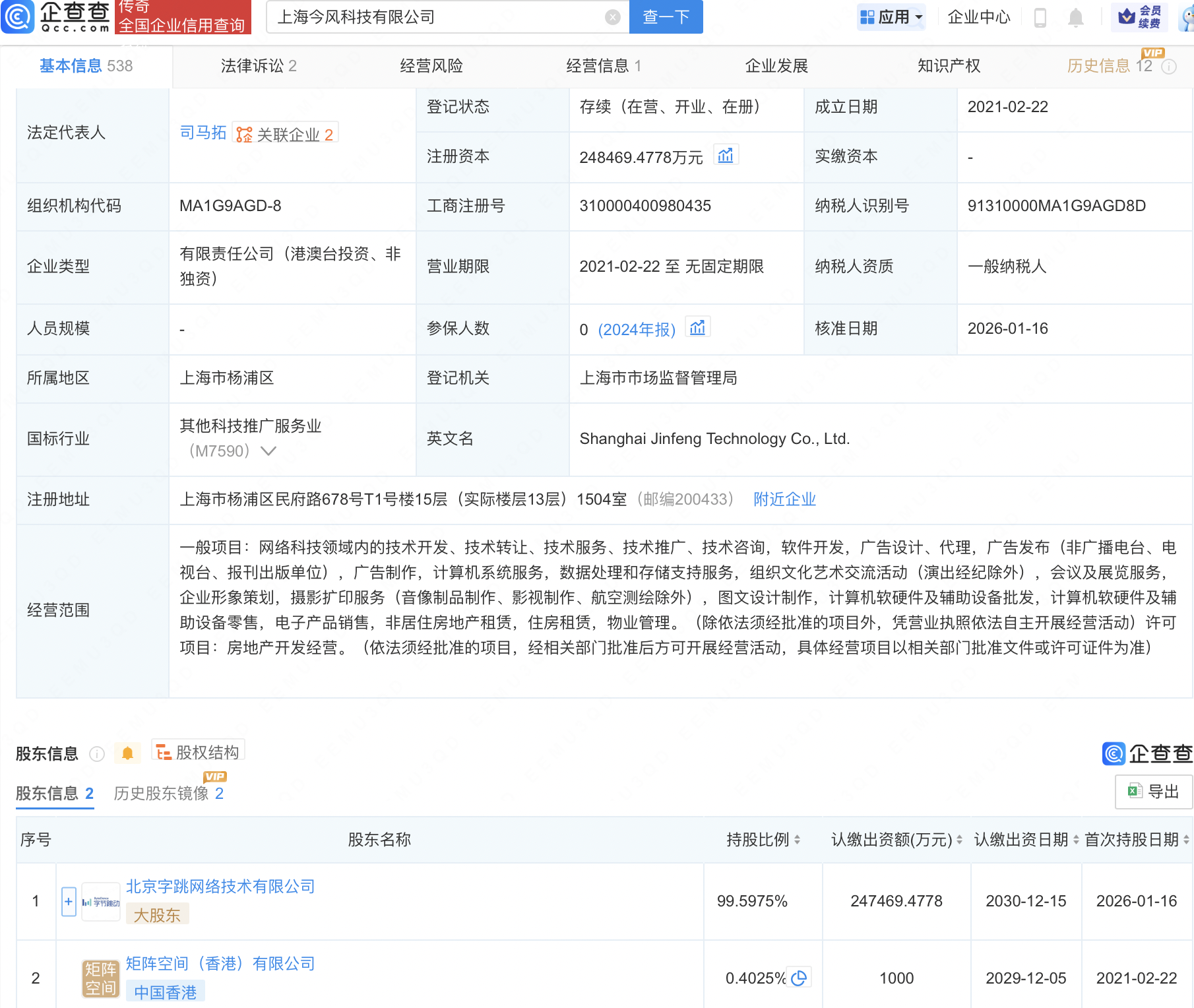 企查查APP显示,近日,上海今风科技有限公司发生工商变更,新增北京字跳网络技术有限公司为大股东,持股约99.6%,原全资股东矩阵空间(香港)有限公司持股比例降至约0.4%。同时,公司注册资本由1000万元增至约24.8亿元,增幅约24747%。企查查信息显示,该公司成立于2021年,经营范围包含:广告制作,计算机系统服务,数据处理和存储支持服务,组织文化艺术交流活动(演出经纪除外)等。