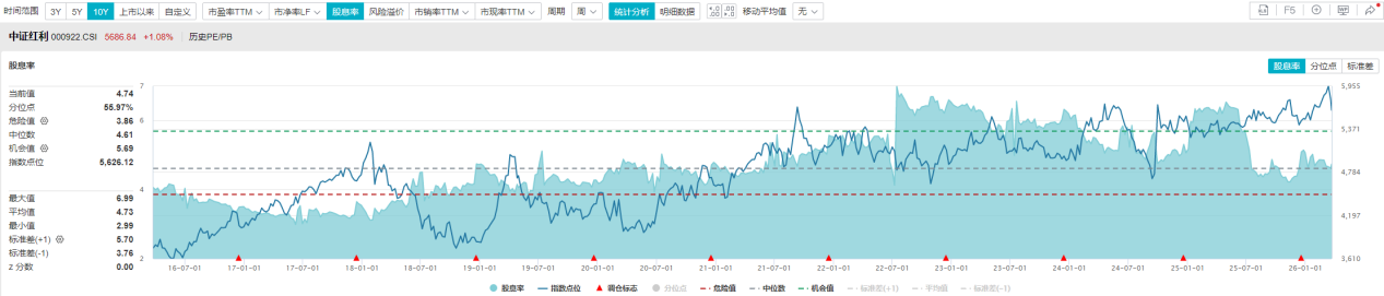 先看估值。中证红利指数最新的股息率已经达到4.74%,同期十年期国债收益率只有1.83%,息差拉大到3.2个百分点。这个息差水平,在近十年的数据里都算得上高位区间。对于保险资金、银行理财这类需要覆盖负债端成本的配置型资金来说,这个价差意味着什么,不用多解释。从历史经验看,中证红利指数的股息率一旦接近5%,往往对应着估值的底部区域。