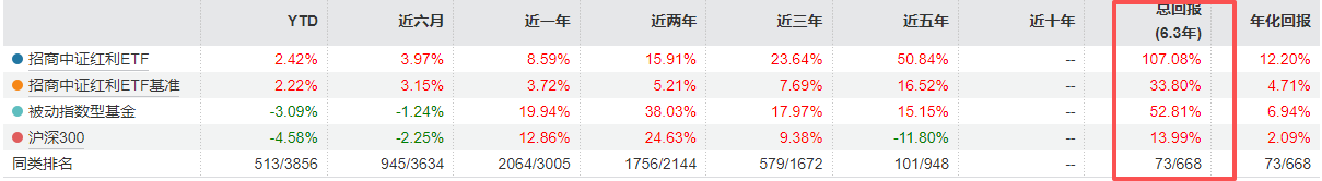 从产品业绩看,中证红利ETF招商(515080)成立以来总回报107.08%,相对业绩基准的超额收益73.28%。