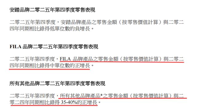 2026年1月20日,安踏体育披露2025年第四季度表现,斐乐零售金额均录得中单位数增长,而迪桑特(DESCENTE)、可隆(KOLONSPORT)等其他品牌同比增长35%—40%。
