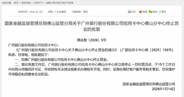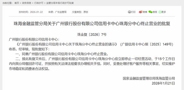 2026年1月8日,江门金融监管分局批复同意广州银行股份有限公司信用卡中心江门分中心终止营业;1月9日中山金融监管分局批复同意广州银行股份有限公司信用卡中心中山分中心终止营业。