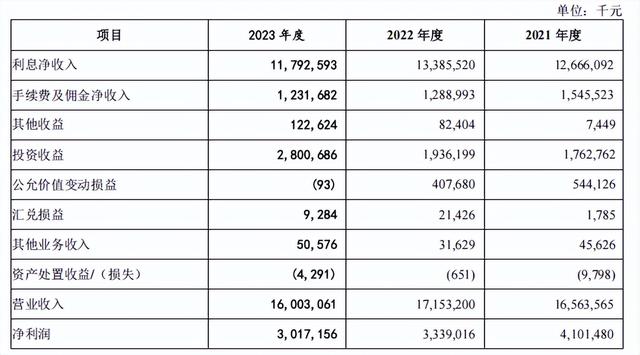 从广州银行招股书的数据来看,其2021年至2023年营业收入分别为165.64亿元、171.53亿元、160.03亿元,净利润分别为41.01亿元、33.39亿元、30.17亿元。
