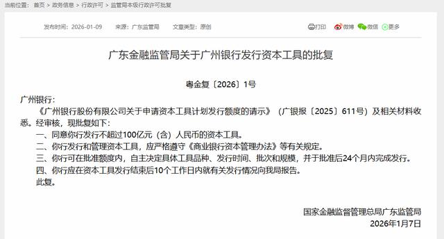 同期,还有广州银行的一项资本端动作。广东金融监管局于2026年1月9日发布《广东金融监管局关于广州银行发行资本工具的批复》,同意广州银行发行不超过100亿元(含)人民币的资本工具,并要求在批准后24个月内完成发行,发行结束后10个工作日内报送有关发行情况。