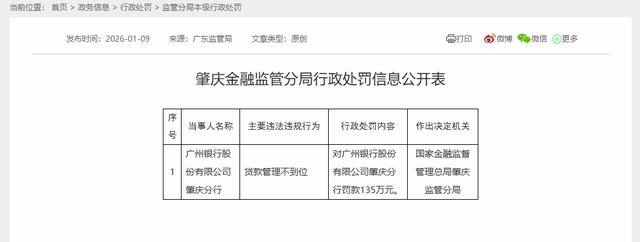 2026年1月9日,广州银行股份有限公司肇庆分行因“贷款管理不到位”,国家金融监督管理总局肇庆监管分局对广州银行股份有限公司肇庆分行罚款135万元。