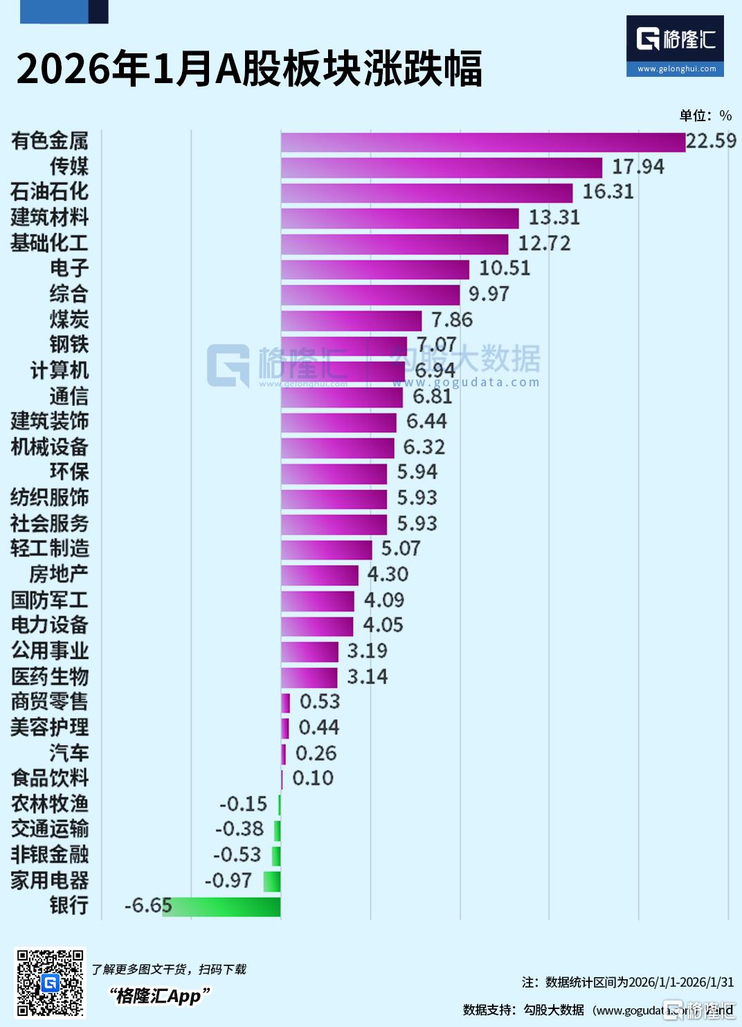 行业板块表现分化显著。上涨阵营中,有色金属以22.59%的涨幅居首,传媒、石油石化、建筑材料、基础化工紧随其后,累计涨幅分别达17.94%、16.31%、13.31%、12.72%,电子、煤炭、钢铁、计算机、通信等板块也同步录得上涨。