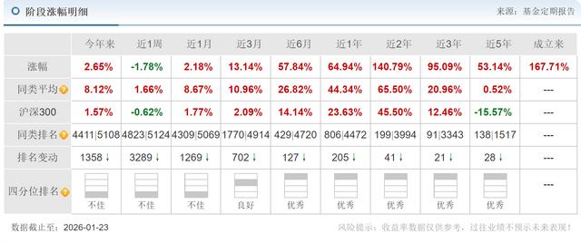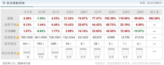 笔者发现,该基金在2025年2季度买入97.39万股的沪电股份,2025年3季度持有190.10万股,2025年4季度持有210.15万股。在该基金持有期间,2025年4月1日-2026年1月23日股票价格上涨了120%。