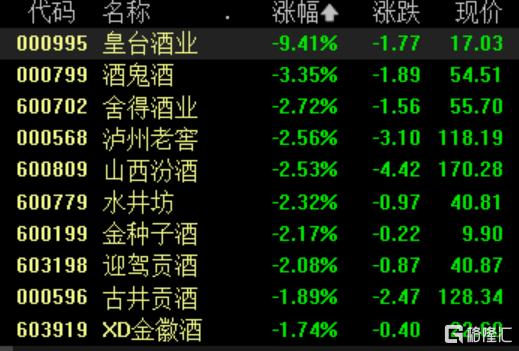 白酒股普跌,皇台酒业跌超9%,酒鬼酒跌超3%,舍得酒业、泸州老窖、山西汾酒、水井坊跌超2%。