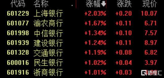 银行股表现活跃,上海银行涨超2%,渝农商行、中信银行、建设银行、交通银行、浙商银行涨超1%。