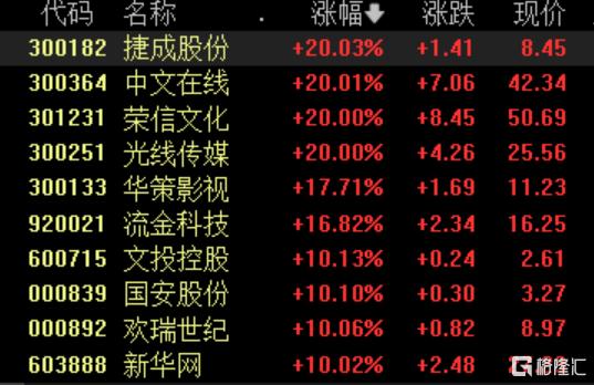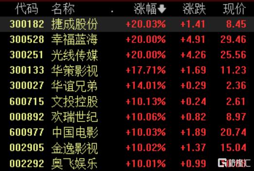 影视股掀涨停潮,捷成股份、幸福蓝海、光线传媒20CM涨停,华策影视涨超17%,华谊兄弟涨超14%,文投控股、欢瑞世纪等多股10cm涨停。