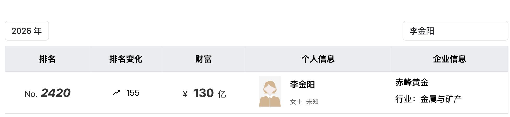 根据股权结构,赤峰黄金实际控制人李金阳共持有公司10.02%的股份;烟台瀚丰中兴管理咨询中心(有限合伙)持有赤峰黄金2.71%股份。以最新收盘价格计算,其持股市值约为98.8亿元。根据胡润研究院披露的2026年全球富豪榜,李金阳以130亿财富位列全球第2420位,排名同比上升155位。