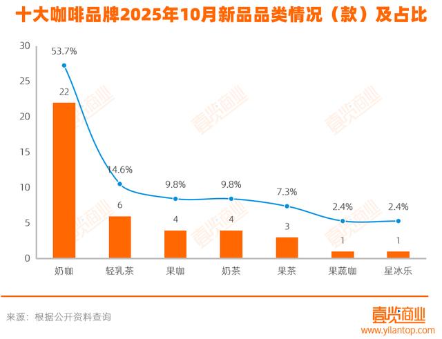 咖啡领域同样呈现出厚重化倾向,奶咖类产品成为推新重点,当月共推出22款奶咖新品(含2款回归),占咖啡新品总量的52.38%。