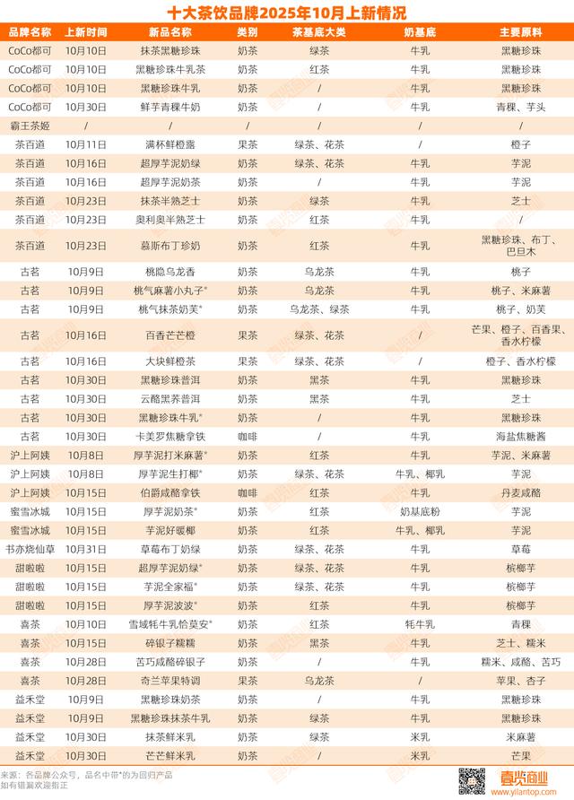 茶饮品牌深耕经典小料,围绕芋泥、黑糖珍珠等经典小料推出系列产品。蜜雪冰城、沪上阿姨、茶百道、甜啦啦均布局多款芋泥新品;黑糖珍珠也获得CoCo都可、益禾堂、古茗等品牌青睐,成为秋冬季回归经典之选。