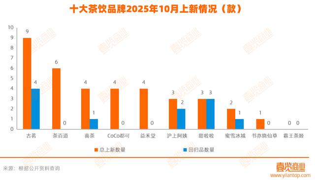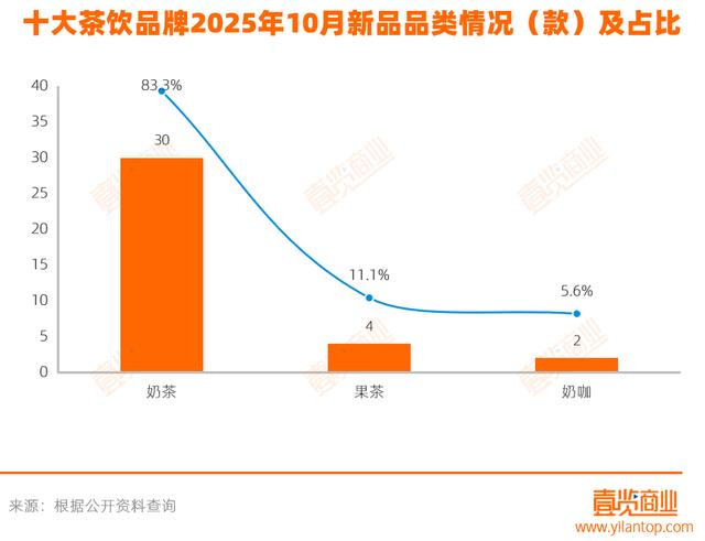 茶饮板块,适合热饮的奶茶品类实现爆发式增长,10月共推出30款奶茶新品,占茶饮新品总量的83.33%,而果茶仅上新3款,热度明显回落。