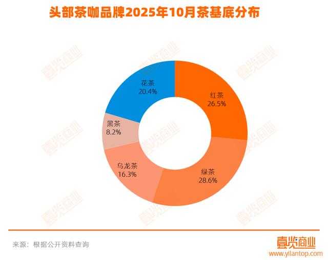 茶底应用方面,绿茶使用频率最高,共有10款饮品使用,占比达28.6%,其中包括5款抹茶饮品;红茶与花茶分别以26.5%和20.4%的占比位列第二、三位。