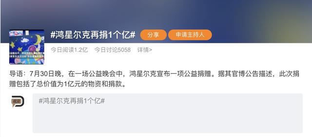 并且在该条信息中带上了#鸿星尔克感恩成长日# 以及#鸿星尔克再捐1个亿# 两个话题,随后#鸿星尔克再捐1个亿# 登上热搜,且阅读也达到了1.2亿次,讨论超过了5000条。