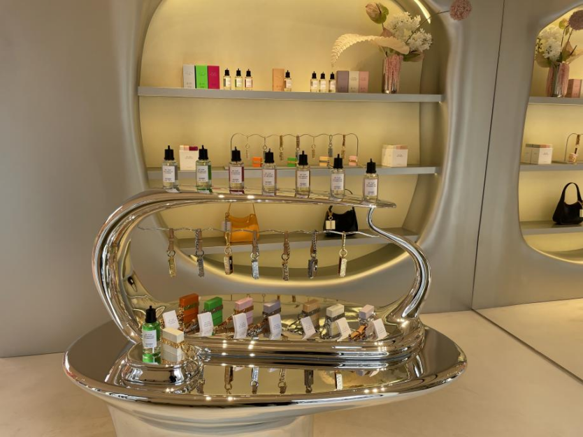 据了解,一层重点打造的是充满金属装置与未来主义感的香氛区域,推出独具创新性的可穿戴香氛“白日梦daydream”系列。该系列也是品牌正式进军香氛领域推出的首个香水系列,包含7款可拼搭香水,配有可再填充的吊饰和金属、皮革挂链,可以作为配饰挂在背包或者衣服上。100ML香水加挂链的价格为1650元,单个挂链430元。