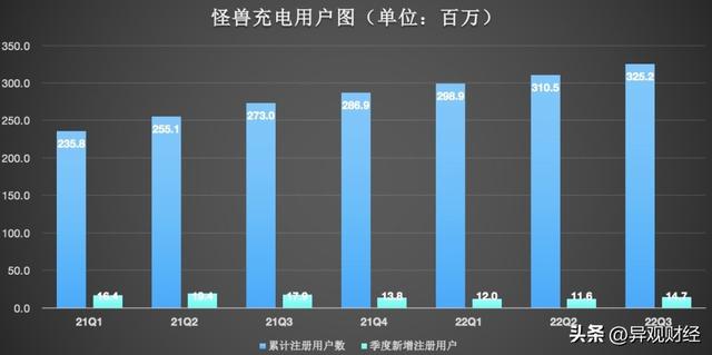据财报披露,截至2022年9月30日,怪兽充电累计注册用户数达3.252亿,单季新增用户1470万,这是最近四个季度中,新增注册用户最高的一次。