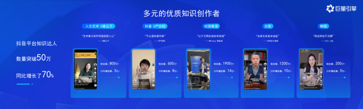 数据显示,2022年抖音平台知识创作者数量突破50万,同比增长70%;知识创作者与教育机构保持高增速增长势头,万粉以上的知识创作者整体规模增幅超90%。