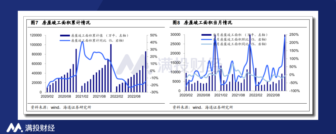 从供给端来看,房地产投资增速下降,房屋的新开工面积和竣工面积的表现也不如人意。2022年,全国房地产开发企业房屋施工面积904999万平方米,比上年下降7.2%;其中,住宅施工面积639696万平方米,下降7.3%。房屋新开工面积120587万平方米,下降39.4%;其中,住宅新开工面积88135万平方米,下降39.8%。房屋竣工面积86222万平方米,下降15.0%;其中,住宅竣工面积62539万平方米,下降14.3%。