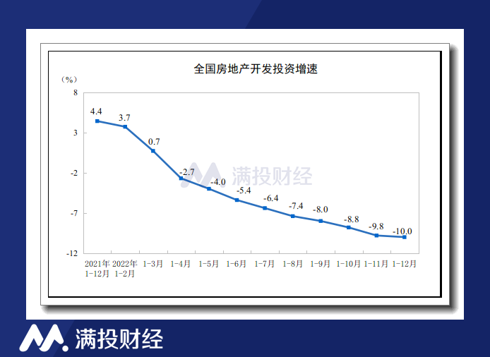 从投资端来看,自2021年开始至今,房地产开发投资累计完成额的同比就一直呈下滑趋势。2022年多重利空因素干扰下,我国经济下行压力大,房地产投资增速也是一降再降。根据统计局数据,2022年,全国房地产开发投资13.29万亿元,比上年下降10.0%;其中,住宅投资10.06亿元,下降9.5%。