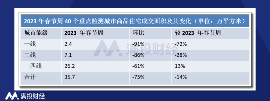 受房企推盘积极性较低影响,2022年春节楼市成交尚未止跌。克而瑞监测数据显示,2023 年春节周40个重点城市成交量仅35.7万平方米,环比下降75%,较2022年同比下降14%,与2019年同期相比下降32%。即便年前中央“降首付降利率”托市,对于购房者的刺激作用依然有限。