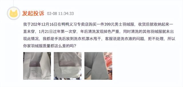 但2月8日一位消费者的投诉目前仍未彻底解决,该网友称自己购买的男士羽绒服,在过年穿过一次后,清洗时发现掉色严重,同时清洗其他羽绒服并没有出现这种情况,客服说是洗衣液的问题,拒不处理,因此该网友发起了投诉,并质疑鸭鸭的羽绒服质量差。这起投诉也获得了鸭鸭官方账号的回应,但截至发稿前,该网友并没有确认投诉完成。