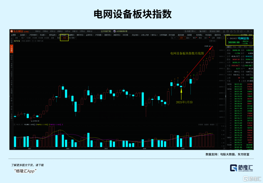 如图,技术层面分析,电网设备板块指数从今年开始月线级别呈现单边趋势上涨,成交量也出现温和放大(未爆量),量价齐升,是非常稳健且具有持续性的走势。