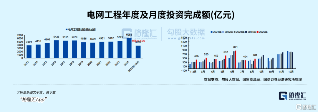 2025年8月全国电网工程投资完成额为481亿元,同比+25.6%; 2025年1-8月全国累计电网工程投资额为3796亿元,同比增长14%。