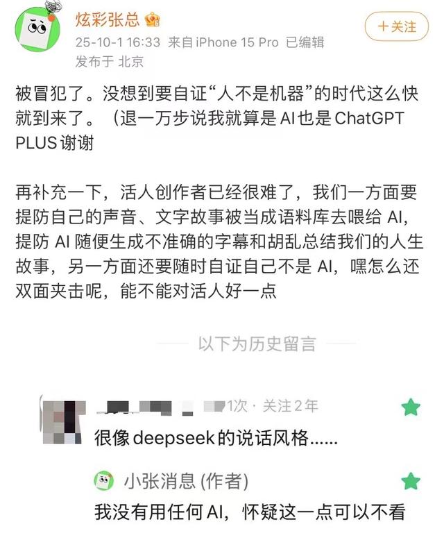 不仅是画师,许多文字创作者近期也饱受质疑。其中,一名播客主创近日就曾发布微博提到自己“被冒犯了”,因为其说话风格被指“很像deepseek的说话风格。”该博主表示,“没想到要自证‘人不是机器’的时代这么快就到来了……活人创作者已经很难了,我们一方面要提防自己的声音、文字故事被当成语料库去喂给AI,另一方面还要随时自证自己不是AI。”
