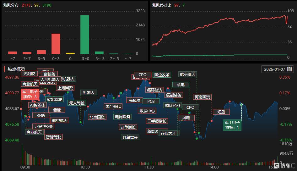 1月7日,A股主要指数收涨,沪指涨0.05%报4085点录得14连阳,深证成指涨0.06%,创业板指涨0.31%。沪深两市成交额2.85万亿,较上一个交易日放量476亿,成交额连续2个交易日超2.8万亿。
