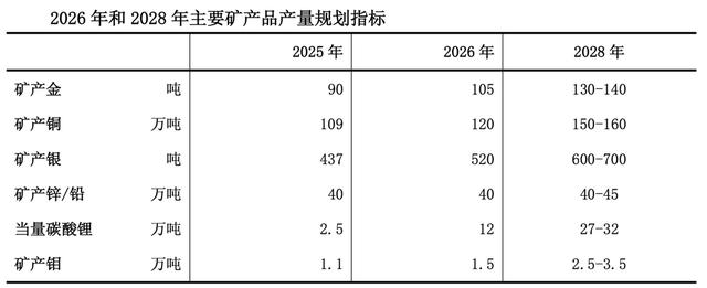 根据紫金矿业发布的2026-2028年三年规划,在2028年黄金产量将达130-140吨,较2025年增幅超30%;铜产量将达150-160万吨,较2025年增幅超35%,剑指全球铜、金产量前三;银产量将达到600—700吨,较2025年增幅超35%;碳酸锂产量将达27-32万吨,较2025年增幅近十倍。