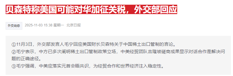 据报道,美国财长贝森特昨日表示,如果中国继续阻碍稀土出口,美国可能会对华加征关税,外交部做出回应。