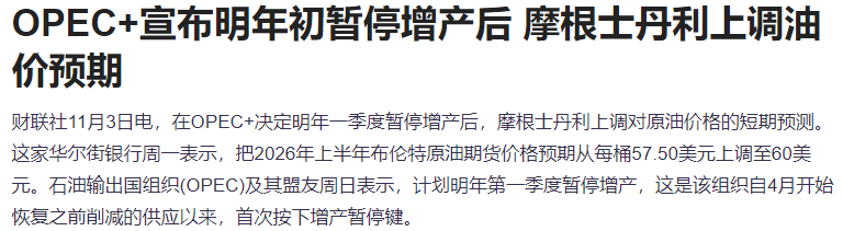 在OPEC+决定明年一季度暂停增产后,摩根士丹利上调对原油价格的短期预测。可能是该消息提振,A股石油天然气板块走强,惠博普、洲际油气涨停,中石油、中海油涨超4%。