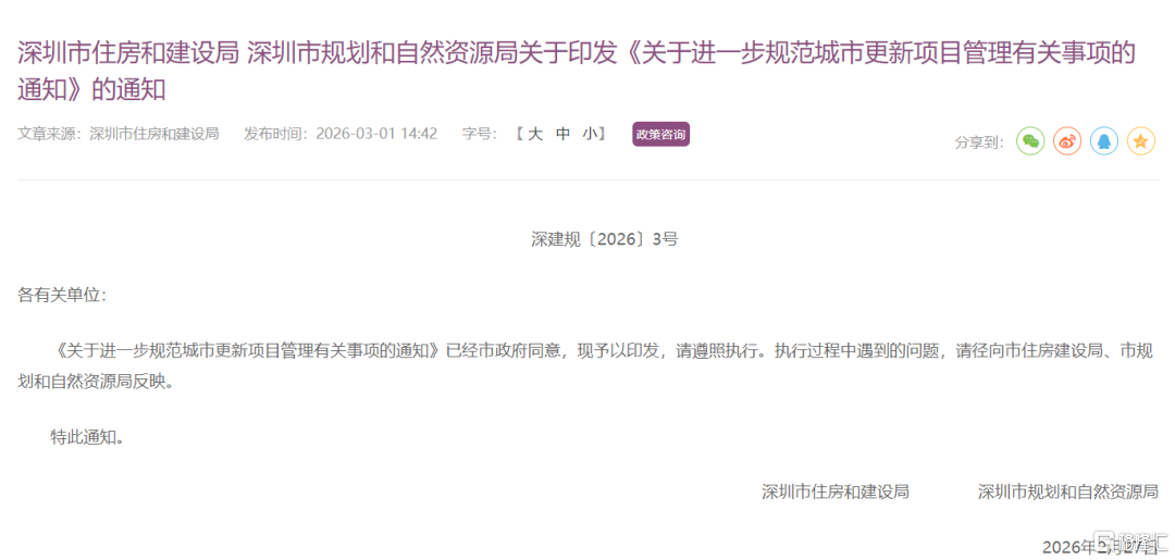 3月1日,深圳住建、规资两大核心部门联手对深圳的城市更新项目松绑,印发《关于进一步规范城市更新项目管理有关事项的通知》(以下简称《通知》),自3月16日起实施,有效期5年。