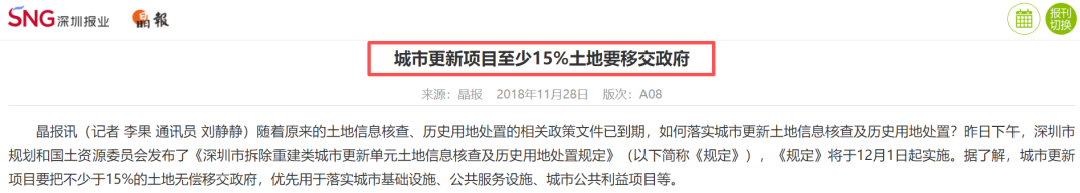 过去深圳的城市更新项目土地移交率卡得比较严格,尤其是要无偿交给相关部门的土地比例。