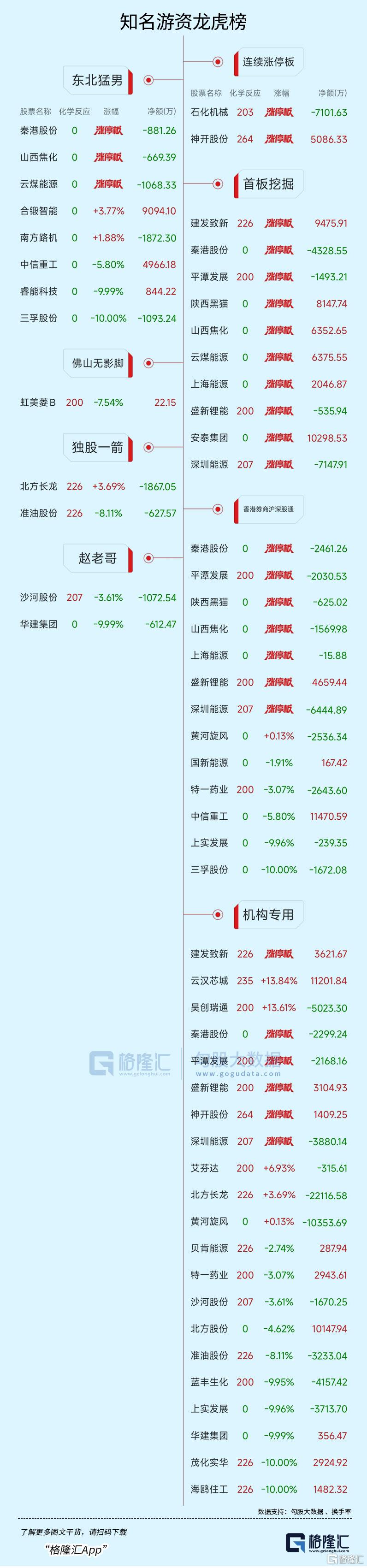 龙虎榜中涉及机构专用席位的个股中,当日净卖出额前三为北方长龙、黄河旋风、蓝丰生化,分别为1.32亿元、1.04亿元、4157.42万元。