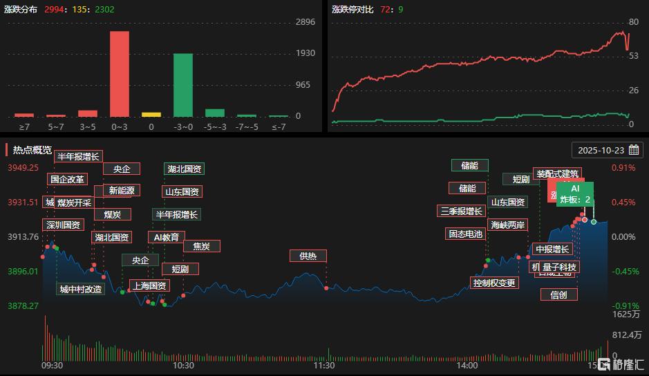 10月23日,A股三大指数尾盘集体翻红,沪指涨0.22%报3922点,深证成指涨0.22%,创业板指涨0.09%,近3000股上涨。市场热点聚焦深圳本地股、煤炭、量子科技板块,另外,超硬材料、培育钻石板块下挫。