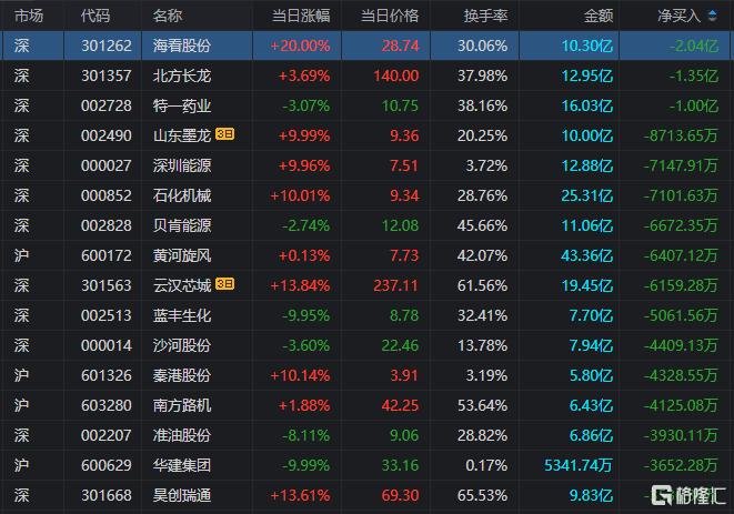 龙虎榜单日净卖出额前三为海看股份、北方长龙、特一药业,分别为2.04亿元、1.35亿元、1亿元。