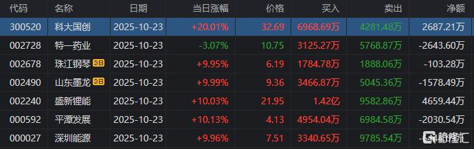 龙虎榜单日净买入额前三为科大国创、合锻智能、北方股份,分别为1.39亿元、1.3亿元、1.05亿元。