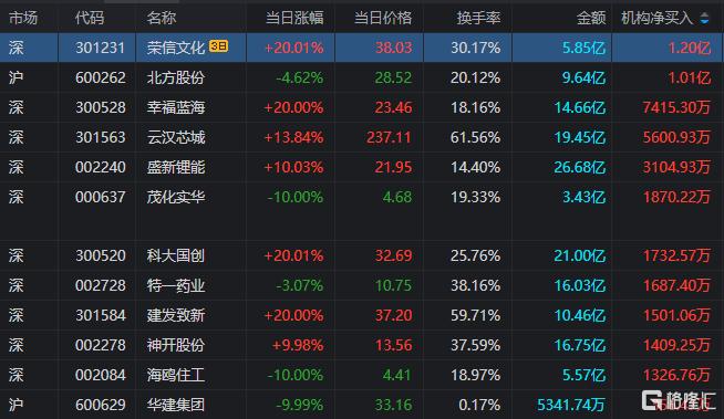 龙虎榜中涉及机构专用席位的个股中,当日净买入额前三为北方股份、幸福蓝海、云汉芯城,分别为1.01亿元、7415.3万元、5600.93万元。