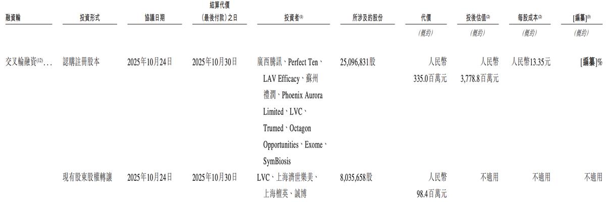 仅就2025年10月的交叉轮融资而言,广西腾讯、Perfect Ten、LAV Efficacy、苏州礼润、Phoenix Aurora Limited、LVC、TruMed、Octagon Opportunities、Exome、Sym Biosis合计出资3.35亿元认购,投后估值37.79亿元,每股成本为13.35元。