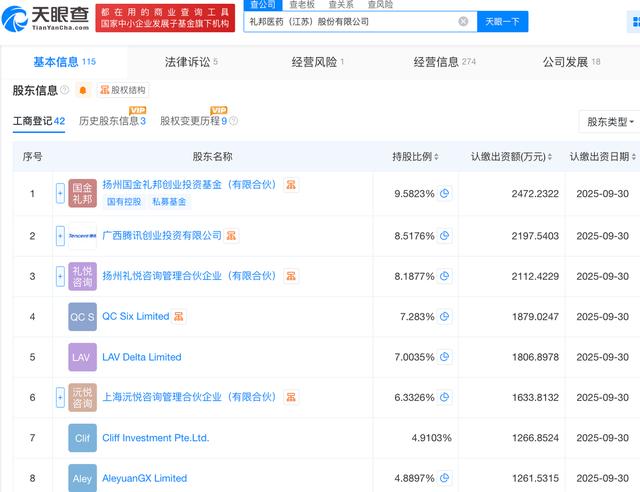 天眼查App信息显示,礼邦医药成立于2021年5月,位于江苏省扬州市。目前,该公司的注册资本约为2.83亿元,法定代表人为Gavin Guoyao XIA(即Gavin Xia),主要股东包括扬州国金、腾讯、扬州礼悦等。