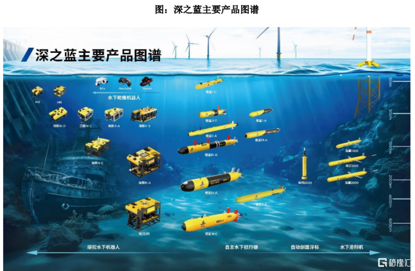 深之蓝的主要产品包括缆控水下机器人、自主水下航行器、水下滑翔机、自动剖面浮标和水下助推机器人等。