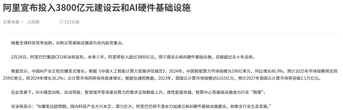 阿里2025年宣布未来三年投入3800亿元于AI+云领域,超过过去十年总和。