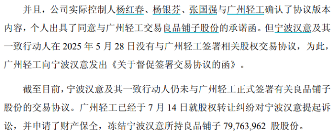 这场纠纷的根源在于宁波汉意的“一女二嫁”操作:早在2025年5月,宁波汉意为化解自身债务,已与广州国资旗下广州轻工签署《协议书》,约定后者通过尽调后受让股份并控制公司,公司实际控制人还出具了书面同意承诺,且协议明确广州轻工在5月28日前享有优先购买权。但宁波汉意最终未按约定签署正式协议,转而在7月与武汉国资旗下长江国贸达成交易,此举直接触发广州轻工的诉讼反击——7月14日提起诉讼并申请财产保全,涉案金额初始为9.96亿元,诉求包括要求立即办理股份过户等。