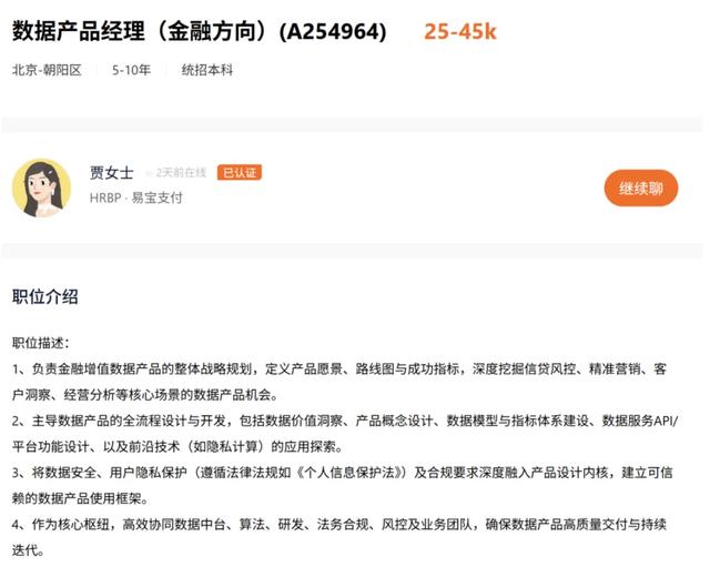 猎聘网上的信息显示,日前易宝支付发布了数据产品经理、金融大客户总监等多个岗位需求。其中数据产品经理(金融方面)的主要职责包括:负责金融增值数据产品的整体战略规划,定义产品愿景、路线图与成功指标,深度挖掘信贷风控、精准营销、客户洞察、经营分析等核心场景的数据产品机会等。
